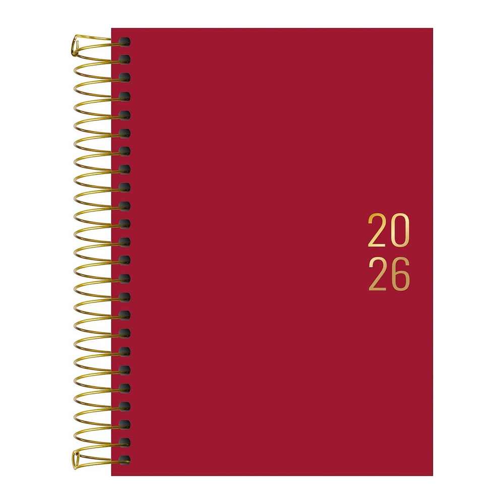 Apresenta uma página por dia (exceto sábado e domingo), capa dura na cor vermelha com hot stamping dourado, planejamento mensal, planejamento anual, calendário 2026/2027 e informações pessoais.