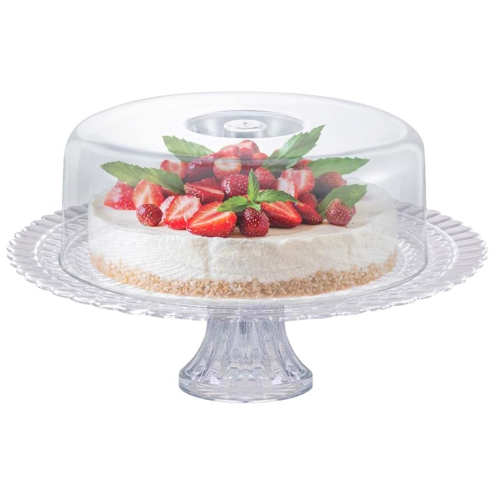 Fabricada em vidro transparente, ela possui um design clássico com pedestal e uma cúpula alta que protege o alimento, além de detalhes em lapidação canelada na base do prato, unindo a beleza da exposição com a funcionalidade de manter seus confeitos frescos e protegidos.
