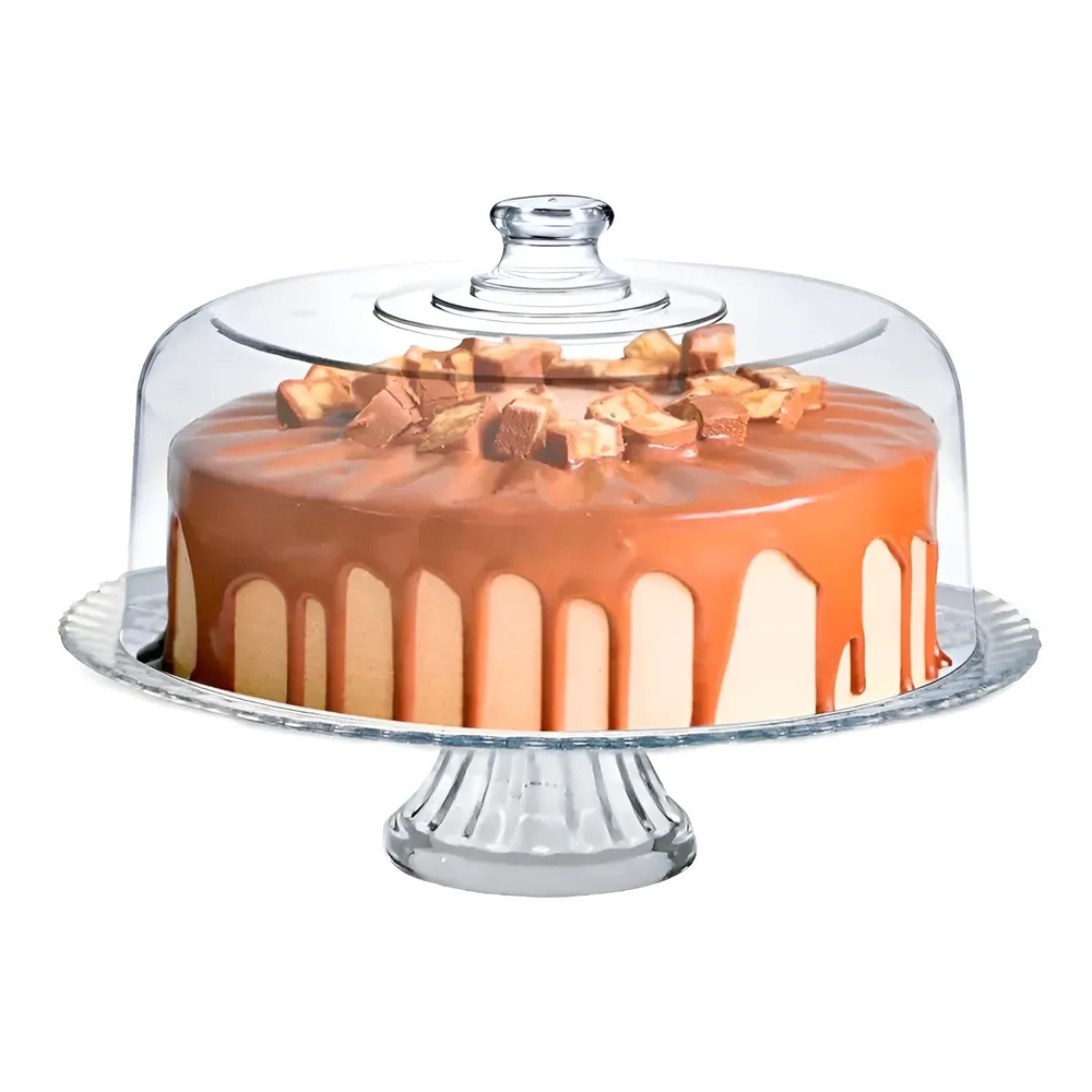 Fabricada em vidro e acrílico transparente, ela possui um design clássico com pedestal e uma cúpula alta que protege o alimento, além de detalhes em lapidação canelada na base do prato, unindo a beleza da exposição com a funcionalidade de manter seus confeitos frescos e protegidos.