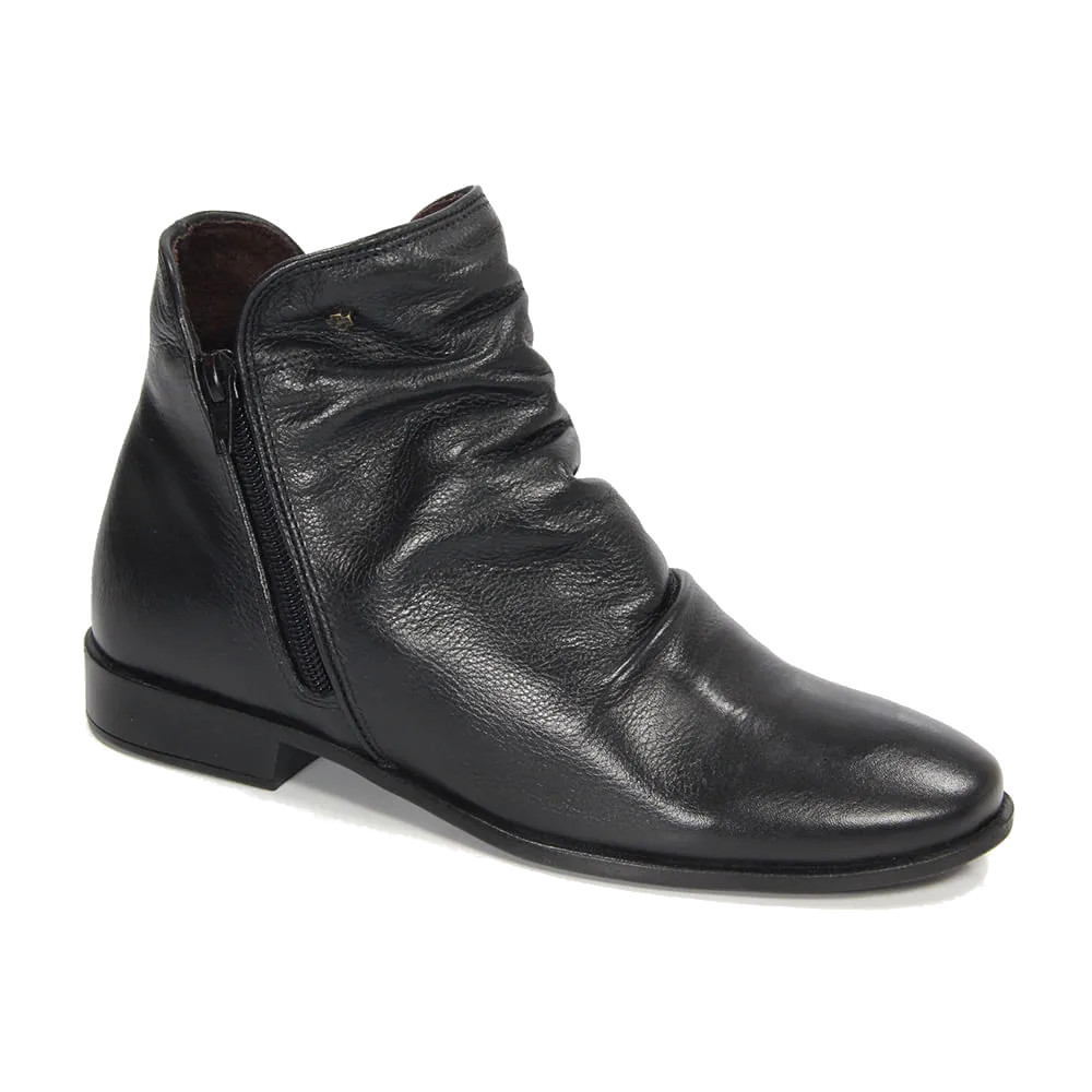 O modelo destaca-se pelo cano curto com acabamento drapeado, que cria um efeito visual moderno e sofisticado, ideal para quem busca fugir do básico sem perder a versatilidade. Com um solado rasteiro e discreto salto flat, ela prioriza o conforto absoluto para o uso intenso no dia a dia, enquanto o fechamento lateral por zíper garante praticidade no calce. O bico arredondado e o brilho natural do couro de alta qualidade tornam esta peça o complemento perfeito para diversas produções, combinando harmoniosamente com calças skinny, leggings ou saias em looks de meia-estação.
