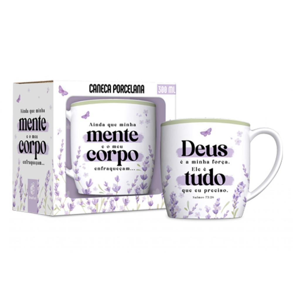 A Caneca de Porcelana Deus é Tudo, da Brasfoot é perfeita para presentear aquela pessoa tão querida. Ideal para tomar aquele café quentinho, um delicioso achocolatado ou até mesmo decorar a casa, apresenta os dizeres "Ainda que minha mente e meu corpo enfraqueçam.", de um lado e do outro, "Deus é a minha força, ele é tudo que eu preciso.", tornando a peça muito mais original. A caneca é fabricada em porcelana, super resistente e de alta qualidade.
