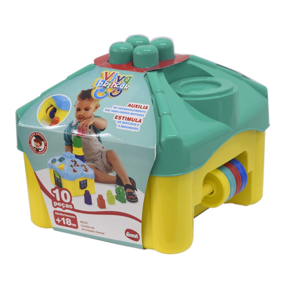 A Casinha de Atividades da Dismat, incentiva o aprendizado das crianças através de letras, números e formas. Ela conta com 3 peças geométricas para encaixe, 4 copinhos para empilhar em torre, 1 rostinho para encaixar no topo da casa e pecinhas rotativas que auxiliam no desenvolvimento de contagem. Uma cartela de adesivos complementa a brincadeira e dá vida à casa com muita criatividade e beleza. Após o encaixe, as pecinhas ficam dentro da casinha. Para recomeçar a brincadeira, basta abrir a portinha e retirá-las.