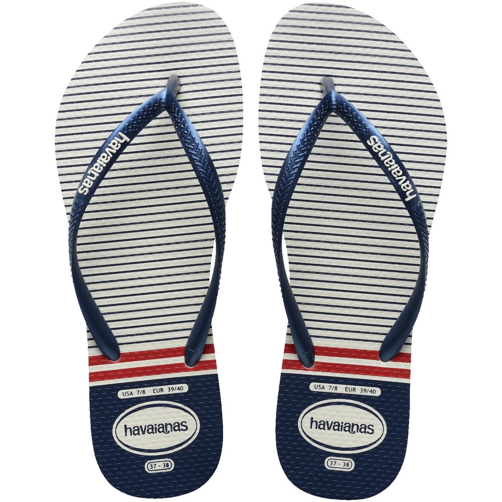 O chinelo feminino Slim Nautical da Havaianas, é confeccionado com material de qualidade, garantindo durabilidade e resistência durante o uso. Apresenta tiras finas na cor azul escuro e palmilha na cor branca com estampa de delicadas linhas azul e vermelha, que remete a beleza náutica. Para completar, seu solado possui boa aderência dando mais segurança ao caminhar. Muito confortável, é uma ótima opção para compor looks descontraídos e informais.