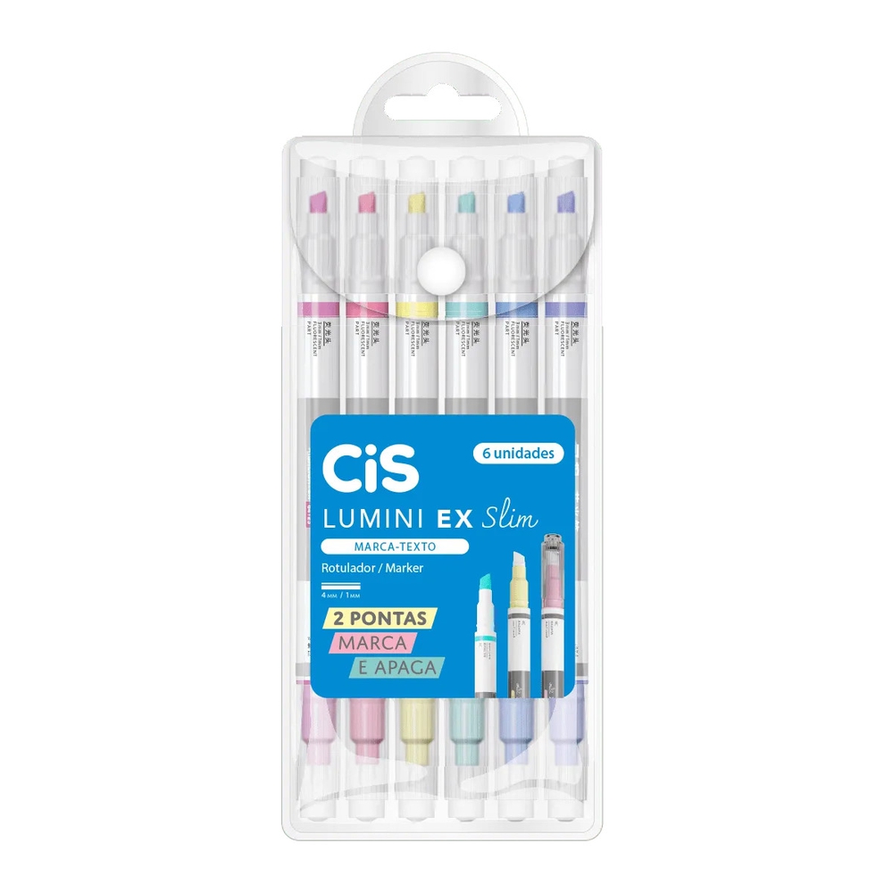 O Conjunto Marca Texto Apagável Lumini EX Slim, da CIS é uma caneta marca-texto versátil e prática, ideal para quem deseja uma experiência de marcação de texto mais limpa e precisa. Com duas pontas chanfradas, uma para marcação e outra para apagar, você pode realçar as partes importantes do seu texto e, se precisar, consegue remover a marcação sem danificar o papel. A tinta à base de água seca rapidamente, evitando borrões e manchas no papel. O corpo robusto e o formato slim garantem um manuseio confortável e fácil, além de facilitar o armazenamento em estojos e bolsas.