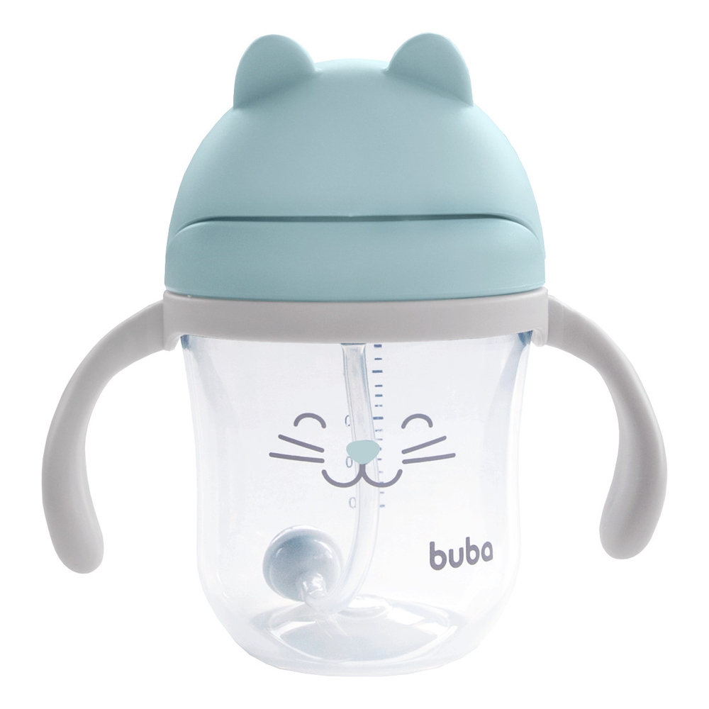 O copo da Buba foi desenvolvido para auxiliar os bebês na hora de trocar a mamadeira por copos. Com o canudo em silicone. Possui uma válvula anti ingestão de ar, que acompanha o líquido evitando sugar ar que causa gases nos bebês. Possui uma tampa giratória em formato de orelhinhas de gatinho que pode ser removida facilmente para limpeza. Além disso, tem alças laterais para facilitar o manuseio.