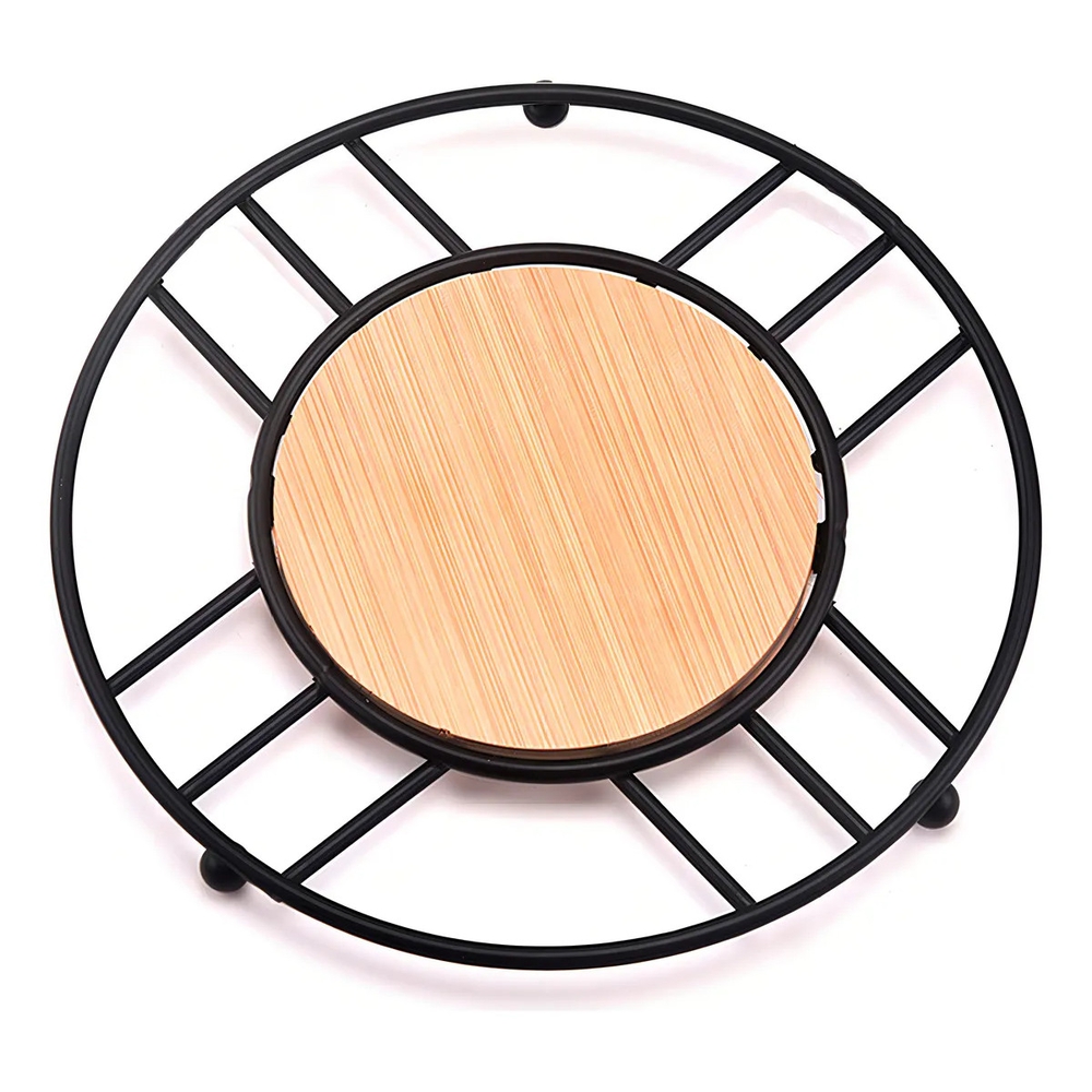 Descanso de Panela Mek, a solução elegante e funcional para proteger suas mesas e bancadas. Este acessório essencial combina o charme rústico de madeira e a modernidade do metal preto, criando uma peça de 18 cm de diâmetro que se harmoniza perfeitamente com qualquer mesa posta.