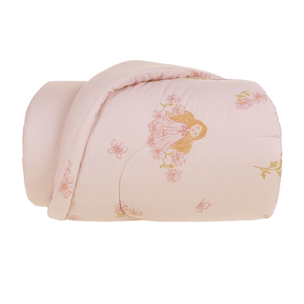 O Edredom Solteiro Infantil Amora, da Karsten traz delicadeza para dentro do seu quarto, sua estampa traz uma temática em tons de rosa, com a personagem em destaque e elementos como flores e borboletas em traços suaves que complementam a cena. No verso, traz uma padronagem bem suave e sutil. Com o toque suave do tecido 100% algodão e tratamento termobond, o edredom Amora é o item perfeito de aconchego.