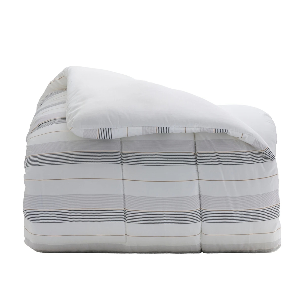 Feito em percal 300 fios de puro algodão egípcio, proporciona toque acetinado, aconchego único e durabilidade superior. A estampa atemporal com listras em tons de cinza, preto e dourado, adiciona sofisticação, estilo e leveza à cama, valorizando cada detalhe do ambiente.
