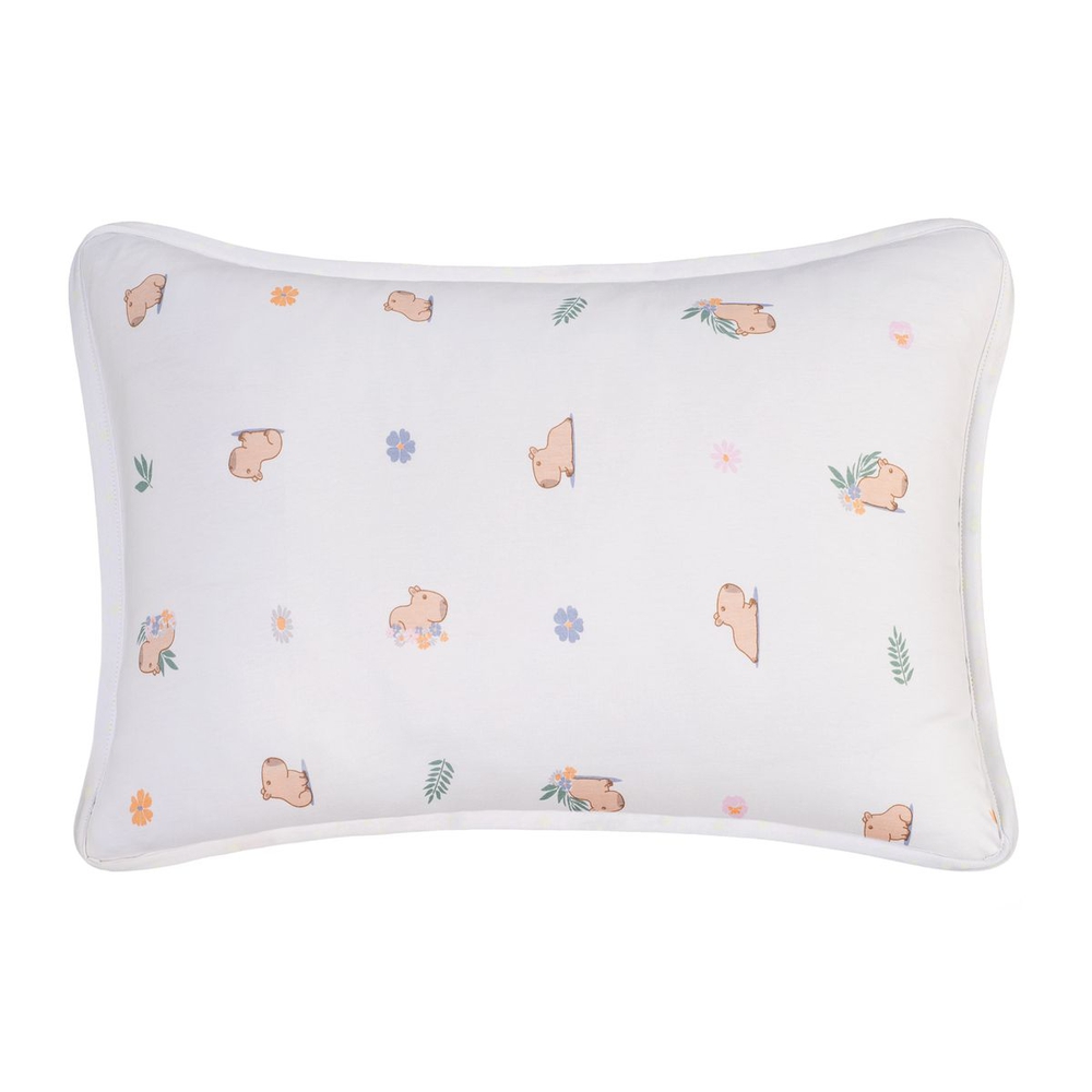 A estampa Capi traz a doçura da simpática capivara para dentro do quarto! Com ilustrações delicadas do animal em diferentes poses, acompanhadas de flores e folhagens, ela cria um cenário lúdico e cheio de alegria. A paleta em tons suaves de rosa, bege e cinza transmite leveza e tranquilidade, deixando o ambiente ainda mais aconchegante. Além de encantadora, é perfeita para garantir noites tranquilas e cheias de conforto.