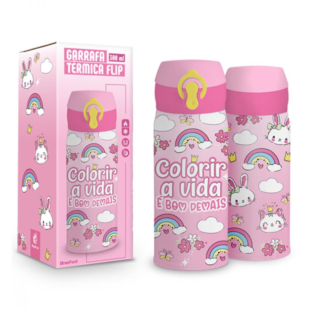 A Garrafa Térmica Flip Gatinha, é a companheira perfeita para manter as crianças hidratadas durante suas aventuras ao ar livre, como caminhadas, pedaladas e brincadeiras. Com um prático botão de abertura da tampa e uma trava antivazamento, esta garrafa oferece facilidade e agilidade na hora de se hidratar. Além do seu design com tema de gatinha, que é super colorido e divertido, a garrafinha ainda vem com os dizeres, "Colorir a vida, é bom demais!", certamente vai encantar os pequenos.
