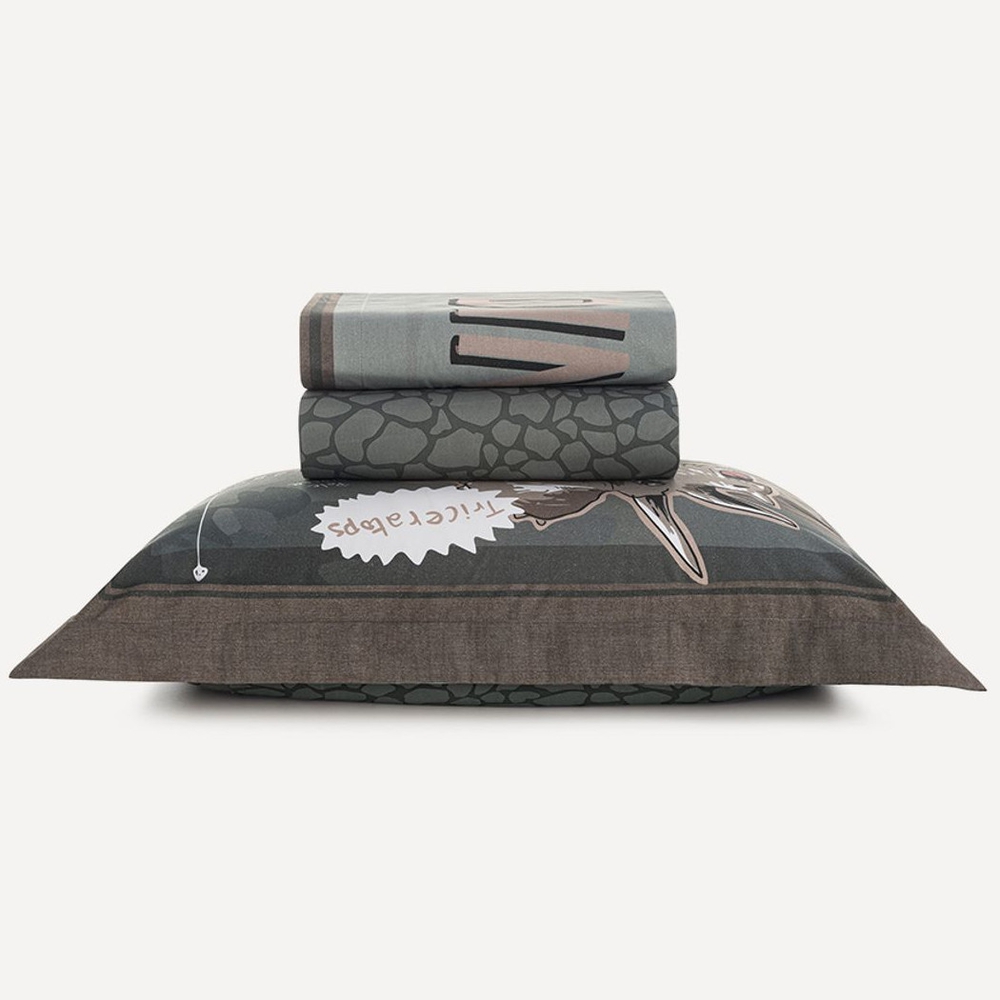 Confeccionado em 100% algodão, o jogo é altamente respirável e hipoalergênico, proporcionando noites tranquilas e confortáveis, é um convite à imaginação e à aventura no universo dos dinossauros. A estampa localizada traz o poderoso T-Rex em destaque no sobre lençol, enquanto a fronha dimensionada exibe o Triceratops com riqueza de detalhes. O lençol com elástico, em tons de cinza e verde escuros, equilibra a composição e oferece versatilidade na decoração. Com visual envolvente e toque macio, este conjunto transforma o quarto em um cenário jurássico, despertando a curiosidade e o espírito explorador das crianças.