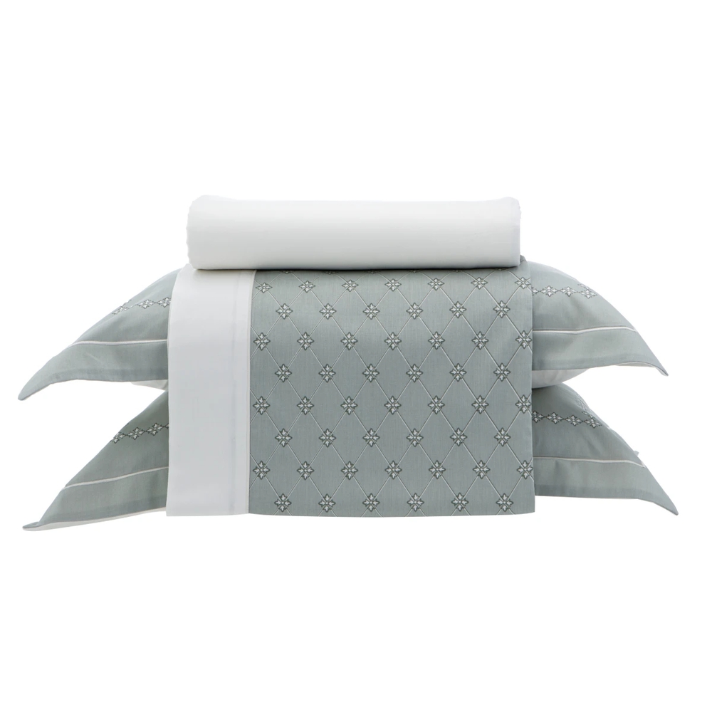 O Jogo de Cama Lazio Tiene, da Kacyumara é produzido em 100% algodão, percal acetinado 300 fios. O modelo faz parte da Coleção Lazio da Linha K da Kacyumara, sua composição de cores é sóbria, elegante e contrastante com seu fundo. Apresenta uma linda estampa com aposta em um visual clássico com detalhes delicados, realçando a decoração com leveza e estilo atemporal, sua composição em tons de verde e branco, é ótima opção para quem gosta de unir requinte e sofisticação. O jogo consiste em lençol superior, lençol inferior ajustável com elástico e duas fronhas da mesma estampa com abas. Perfeito para a decoração do quarto.