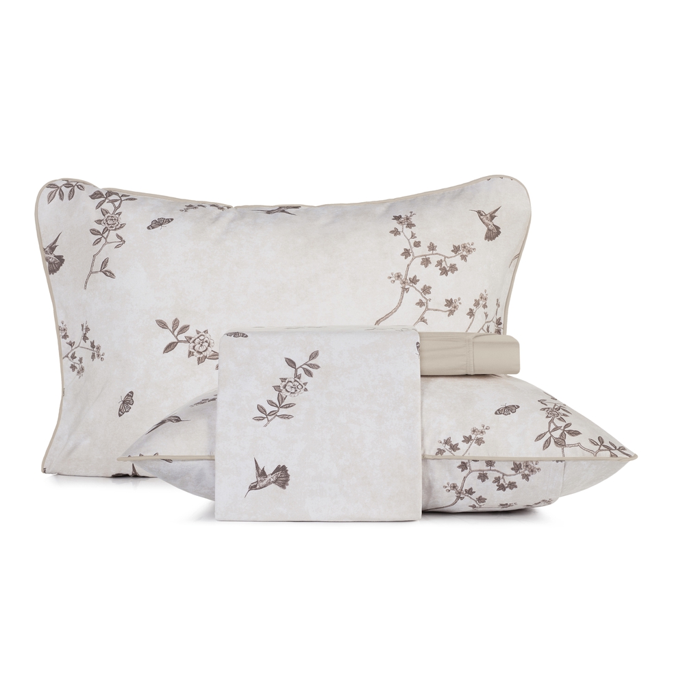 A estampa Paradis Composê traz delicadeza e elegância para o quarto com desenhos de pássaros e folhagens em tons sutis sobre o fundo bege mocha. Confeccionada com enchimento em poliéster thermobonder macio e leve, garante conforto e praticidade no dia a dia. Versátil e super aconchegante, é prática e combina com qualquer estação e estilo de decoração.