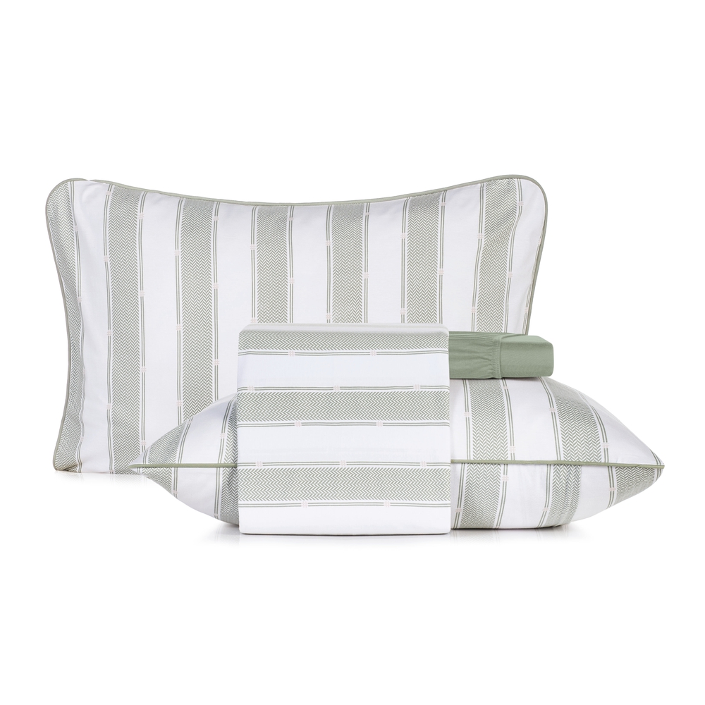 A estampa Trilho conta com visual contemporâneo em listras paralelas, que valoriza a decoração do quarto, enquanto a malha de algodão garante conforto térmico em todas as estações.