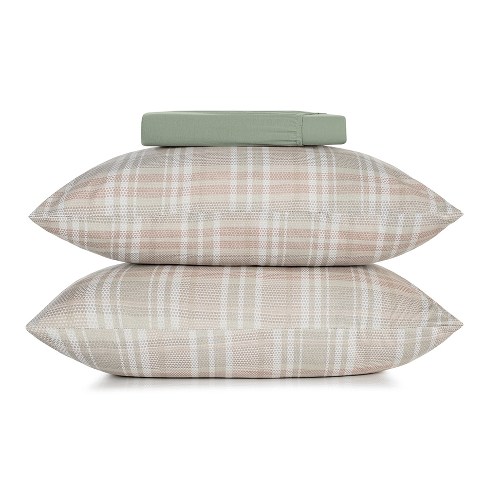 Feito com 100% algodão de fio penteado, este conjunto oferece uma suavidade excepcional e durabilidade superior, proporcionando uma sensação de aconchego incomparável. A estampa Marea aposta no clássico xadrez em desenhos geométricos suaves, ideal para composições modernas e elegantes, enquanto Verde Bond traz a sofisticação do tom verde liso, versátil e acolhedor para qualquer ambiente.