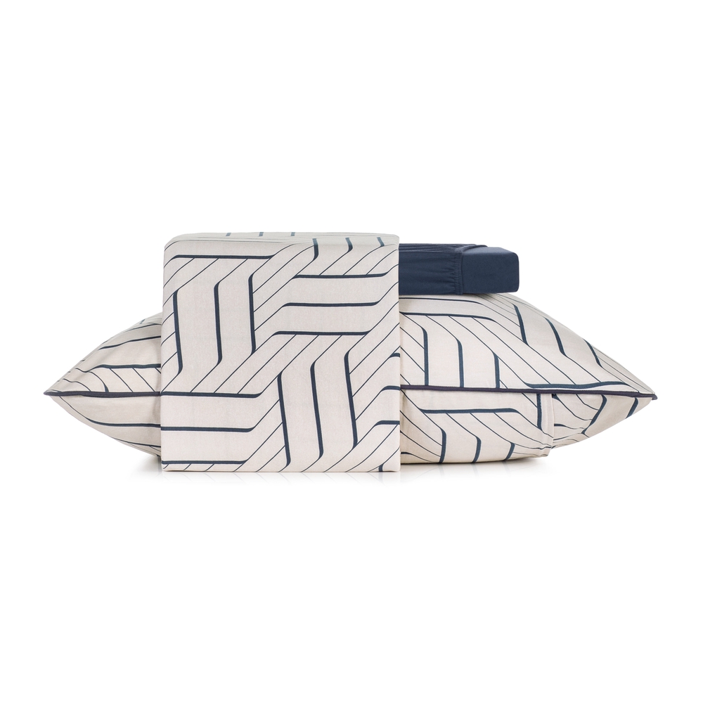 A estampa Zigue conta com visual geométrico contemporâneo, que valoriza a decoração do quarto, enquanto a malha de algodão garante conforto térmico em todas as estações.