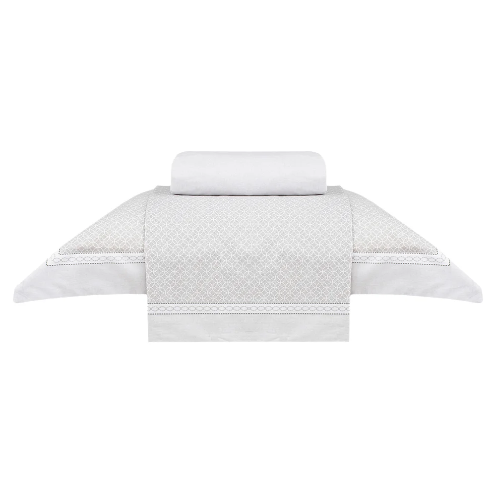 O mix harmonioso entre nuances suaves de tons de bege e ornamentos geométricos resulta em uma composição que transmite aconchego e sofisticação. O jogo de cama vem com sobre lençol nas medidas 1,70m x 2,40cm, fronha com abas e acompanha lençol com elástico de 1,00m x 2,00m ideal para colchões de até 35cm de altura, oferecendo um caimento impecável e uma sensação de conforto que se estende por toda a cama. Um convite irresistível para noites relaxantes e uma decoração com beleza singular.