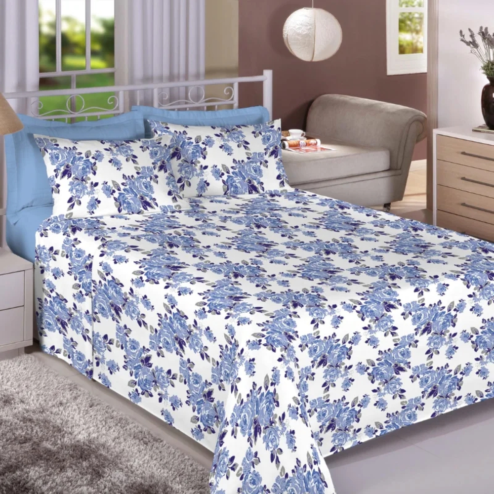 Jogo de Cama Premium Linea Solteiro Flores Azuis - 180 Fios - Estamparia