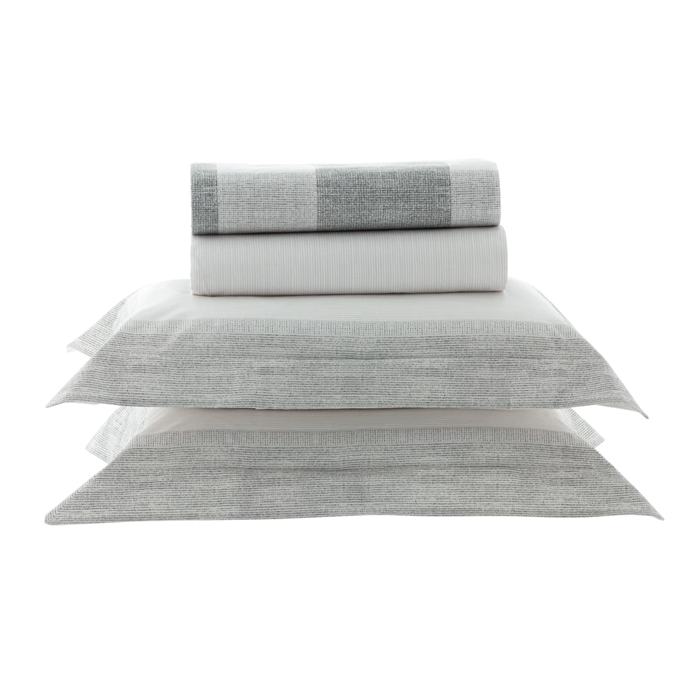 O Jogo de Cama Vida Bela Casal Tafet, da Kacyumara é elaborado em tecido 100% algodão percal 200 fios, desenvolvido pensando no seu conforto e garantindo um toque extremamente macio e suave, proporcionando muita tranquilidade nas horas de descanso. O sobre lençol mede 2,20m x 2,40m, com dobra feita que valoriza o acabamento da cama posta e traz um ar de cuidado aos detalhes. O lençol de elástico tem medidas de 1,40m x 1,90m sendo ideal para colchão de até 30cm de altura. As fronhas, com tamanho de 50cm x 70cm, possuem abas largas, que emolduram os travesseiros e completam a estética refinada da composição. Cada detalhe do conjunto foi pensado para transformar seu descanso em um verdadeiro momento de bem-estar. A estampa combina tons suaves de verde em xadrez e linhas finas, criando uma composição harmônica e sofisticada que se adapta facilmente a diferentes estilos de decoração.