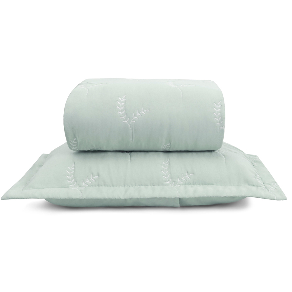Com tecido washed extra macio e enchimento com toque de pluma, ele garante conforto e leveza para o seu quarto. Os bordados em formato de ramos no cobre leito e nos porta travesseiros adicionam um charme especial à composição.