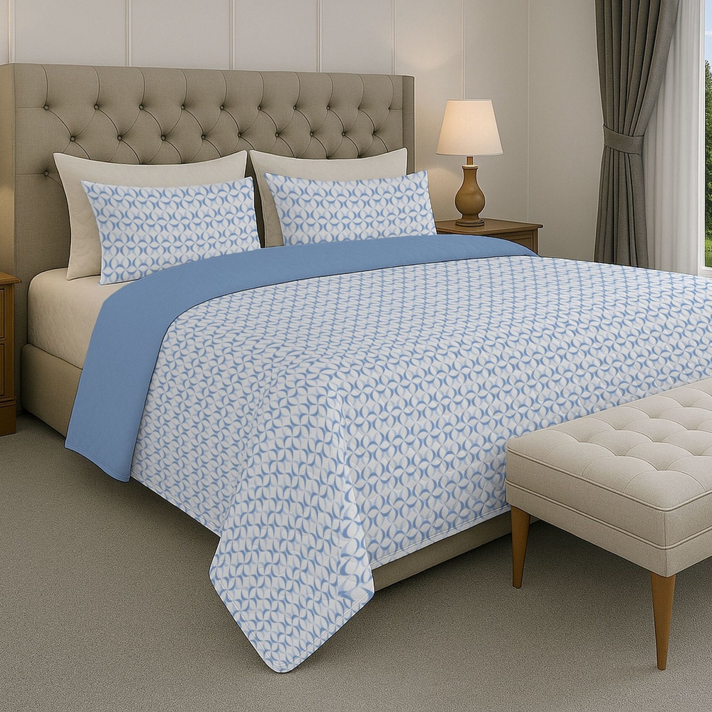 O jogo conta com uma colcha e 2 porta travesseiros, em tom de azul suave, com estampa geométrica, é super elegante sendo criado na medida certa para deixar o seu quarto ainda mais aconchegante e agradável. Para completar, permite ser usado com a elegância da dobra feita, deixando seu quarto ainda mais sofisticado!