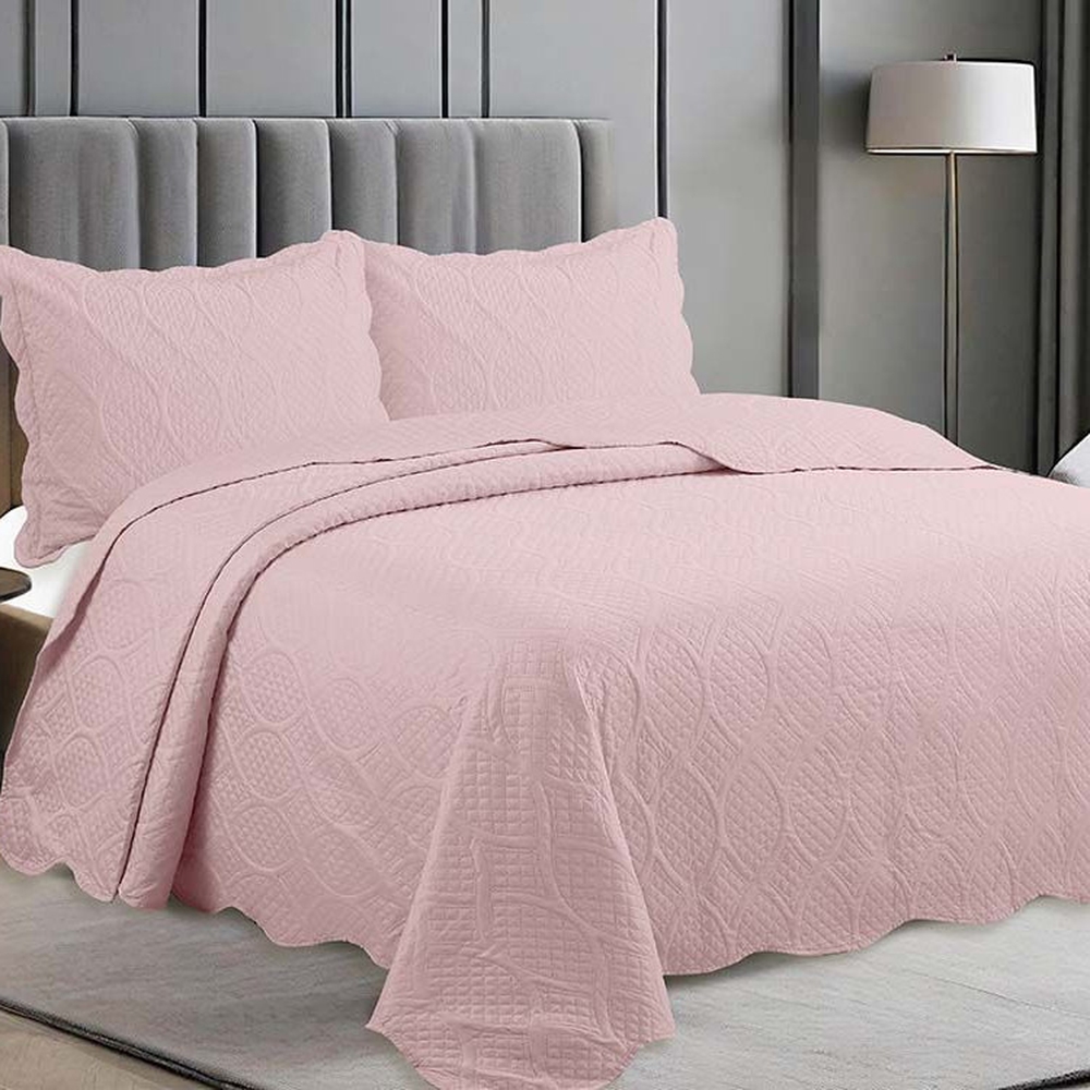 Confeccionada em microfibra (100% poliéster), oferece toque macio, leveza e fácil manutenção. O acabamento matelassado em relevo valoriza a textura do tecido e compõe a cama com elegância, enquanto a secagem rápida e a resistência do material facilitam a rotina. O jogo é composto por três peças: uma colcha e dois porta travesseiros, todos com acabamentos de alta qualidade e na cor rosa claro.