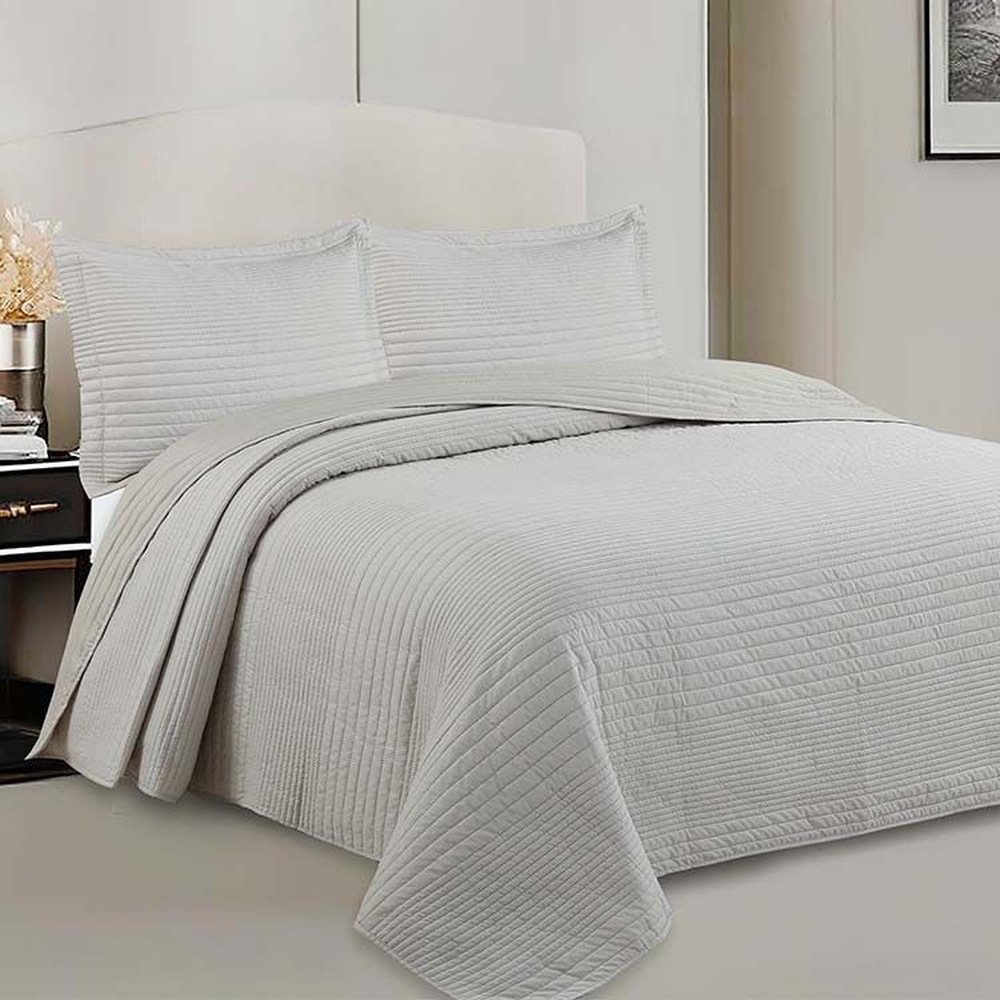 Confeccionada em microfibra (100% poliéster), oferece toque macio, leveza e fácil manutenção. O acabamento matelassado em relevo valoriza a textura do tecido e compõe a cama com elegância, enquanto a secagem rápida e a resistência do material facilitam a rotina. O jogo é composto por três peças: uma colcha e dois porta travesseiros, todos com acabamentos de alta qualidade e na cor bege.
