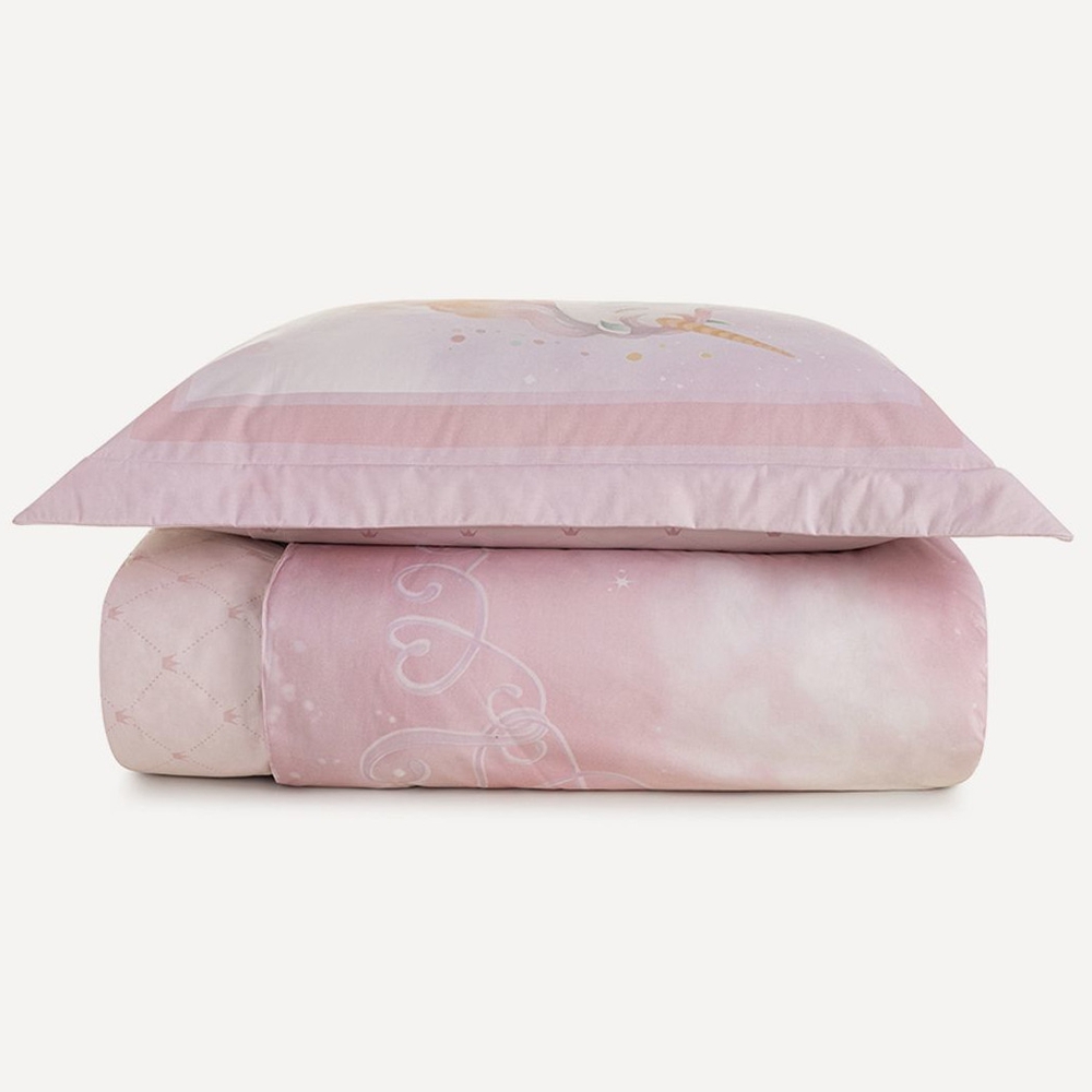 Oferece fantasia e delicadeza ao quarto infantil com uma estampa localizada exclusiva. A frente apresenta a cena mágica da princesa com seu unicórnio diante do castelo nas nuvens, criando um universo de sonho. Já o verso traz uma estampa ornamental suave com matelassado oculto em formato de coroa, adicionando textura e elegância. Acompanha porta travesseiro com estampa coordenada, trazendo ainda mais charme. Ideal para compor um ambiente lúdico e cheio de encanto.