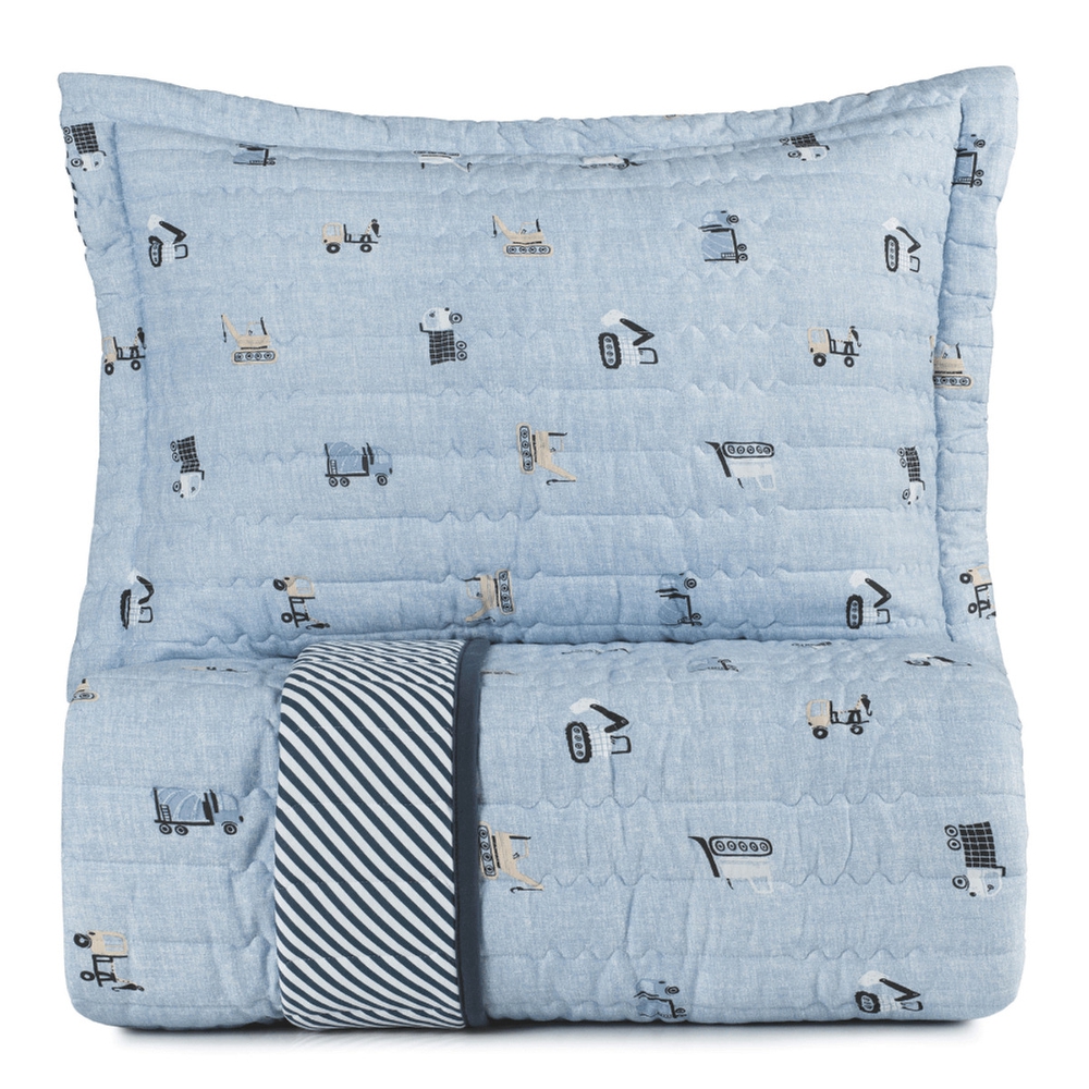 A estampa Mini Obra, traz um design lúdico com ilustrações delicadas de tratores, guindastes, caminhões e prédios em construção sobre um fundo azul suave. A colcha é confeccionada em tecido de malha 100% algodão com fio penteado e ação anti-pilling que confere ainda mais maciez e durabilidade às peças, o Jogo de Colcha Mundo Kids proporcionará maciez e aconchego para a hora de dormir dos pequenos. A colcha é dupla face e possui enchimento com ação antimicrobiana, que impede a proliferação de ácaros, fungos e bactérias, prevenindo alergias respiratórias e garantindo um sono tranquilo e saudável.
