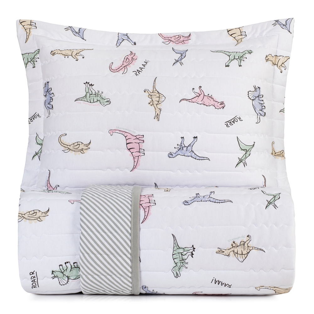 Com a estampa Rugidino, a hora de dormir ganha um toque pré-histórico cheio de diversão! Dinossauros coloridos passeiam pelo tecido macio, trazendo alegria e imaginação para o quarto infantil. A colcha é confeccionada em tecido de malha 100% algodão com fio penteado e ação anti-pilling que confere ainda mais maciez e durabilidade às peças, o Jogo de Colcha Mundo Kids Malha Fio Penteado proporcionará maciez e aconchego para a hora de dormir dos pequenos. A colcha é dupla face e possui enchimento com ação antimicrobiana, que impede a proliferação de ácaros, fungos e bactérias, prevenindo alergias respiratórias e garantindo um sono tranquilo e saudável.