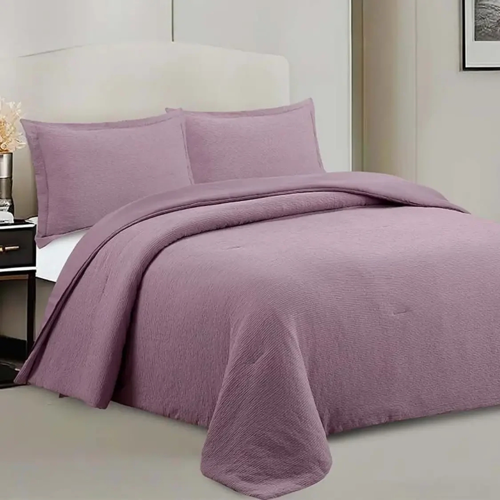 Confeccionada em microfibra (100% poliéster), oferece toque macio, leveza e fácil manutenção. O acabamento em relevo valoriza a textura do tecido e compõe a cama com elegância, enquanto a secagem rápida e a resistência do material facilitam a rotina. O jogo é composto por três peças: uma colcha e dois porta travesseiros, todos com acabamentos de alta qualidade e na cor rose.