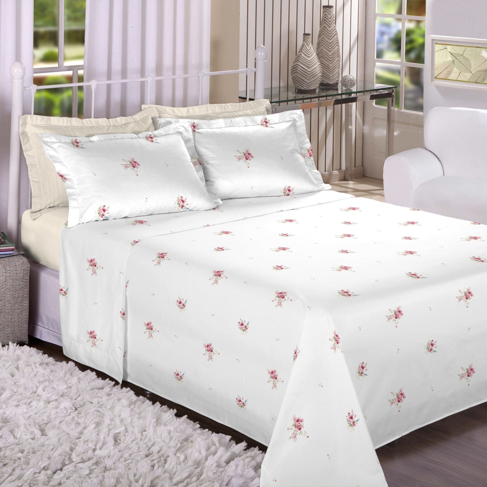 Embalagem: 1 lençol plano, 1 lençol com elástico e 2 fronhas