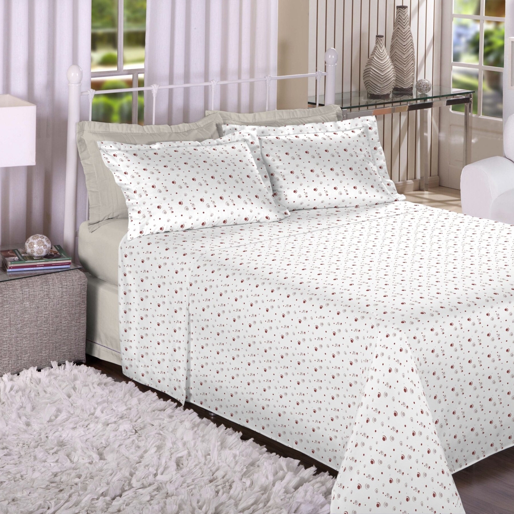 Embalagem: 1 lençol plano, 1 lençol com elástico e 2 fronhas