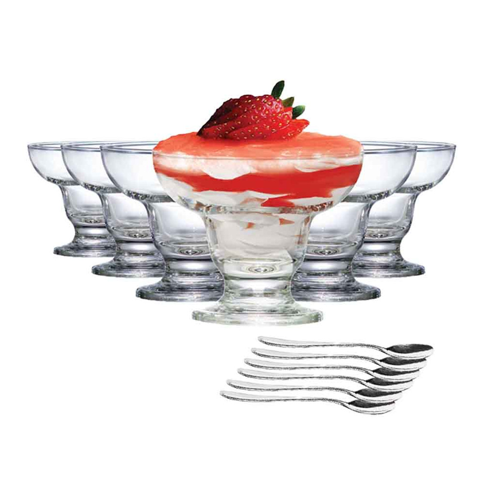 Completo, o kit é composto por 12 peças essenciais, incluindo 6 taças de vidro com capacidade para 300 ml e 6 colheres de inox, prontas para servir até seis pessoas. As taças, fabricadas em vidro de alta transparência e resistência, destacam-se pelo design contemporâneo e delicado da linha Cancun, valorizando a apresentação visual de sorvetes, mousses, saladas de frutas e diversas sobremesas.
