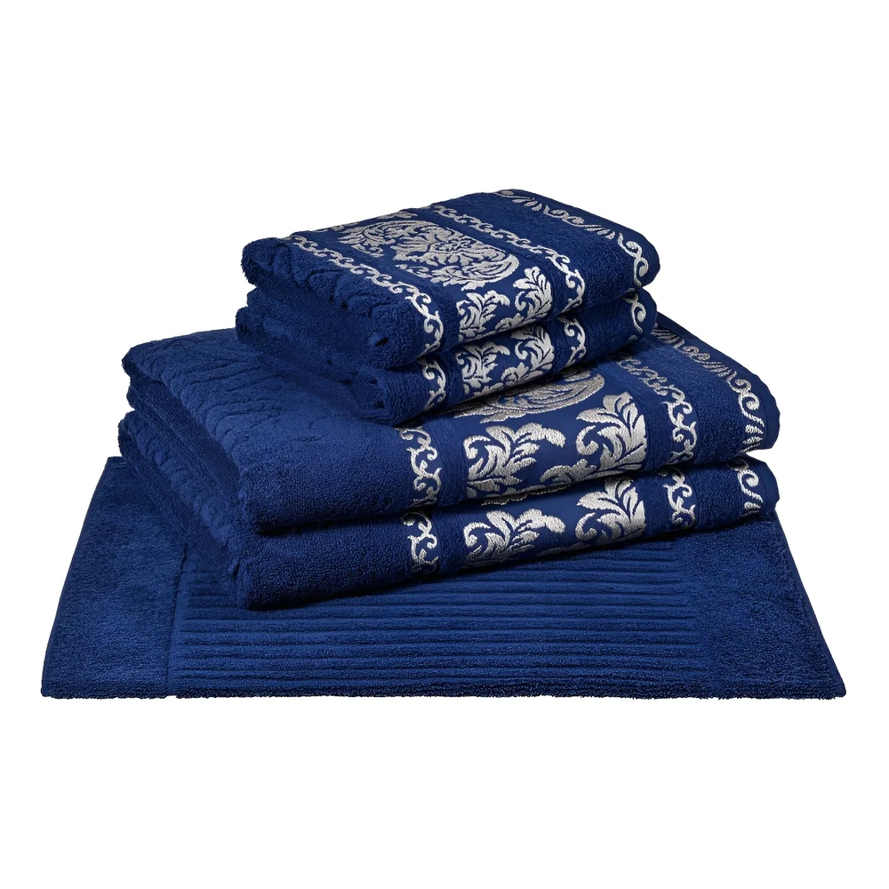 O kit é composto por 2 toalhas de rosto, 2 toalhas de banho e 1 piso na cor marinho, as tolhas contam ainda com aplicação de amaciante hidrófilo que confere um cheiro agradável.