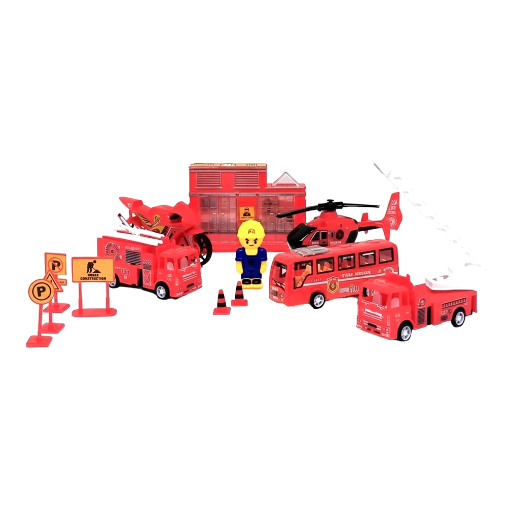 Contém: 1 helicóptero, 1 moto, 1 ônibus, 2 carros de bombeiros, 1 centro de comando, 2 cones, placas sinalizadoras, 1 bonequinho