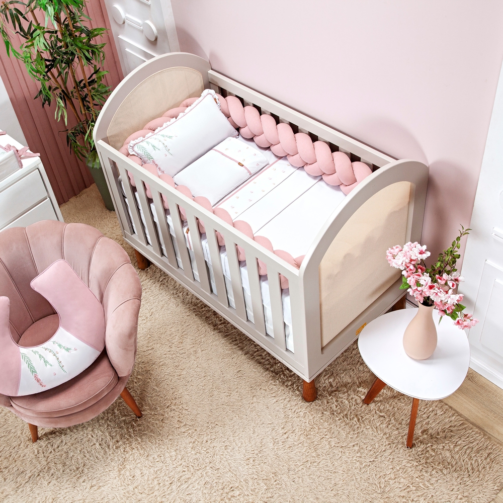O modelo Luna é na cor rosê, o jogo de lençol e a almofada possuem lindos bordados delicados de raminhos florais com borboletas e uma trança que envolve os quatro lados do berço, proporcionando um toque macio e tornando o sono do bebê mais confortável. As peças são compostas por um zíper, para que a capa possa ser retirada para lavagem.