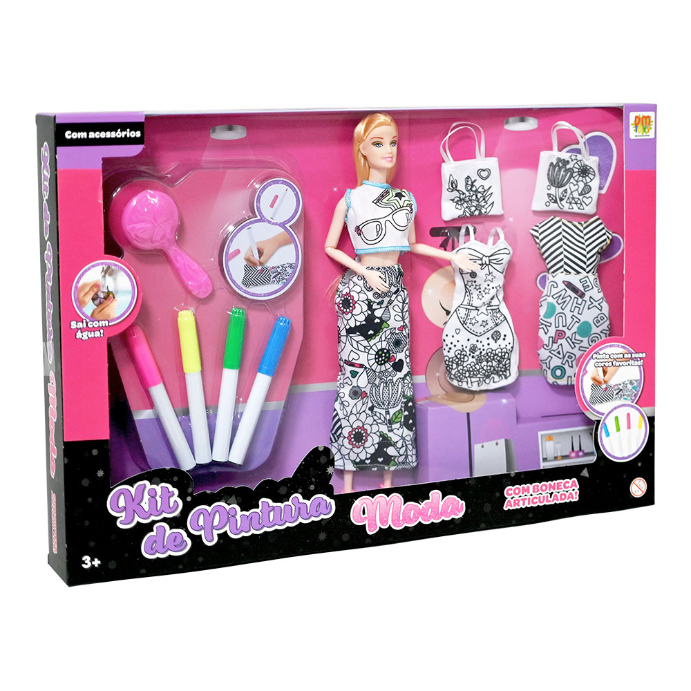 Muito divertido, vem com uma boneca articulada, roupinhas e bolsas para você usar a sua criatividade pintando com as canetinhas e deixar a sua boneca ainda mais estilosa. Depois é só lavar e recomeçar a brincadeira.