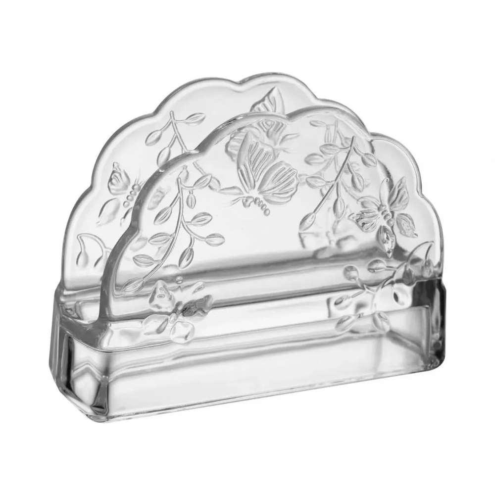 Confeccionado em cristal ecológico transparente, ele apresenta um design com o tema de borboletas em alto relevo, que não só organiza os guardanapos de papel de forma prática e acessível, mas também atua como um belo detalhe decorativo que harmoniza com diversos estilos de louças, especialmente as mais românticas ou primaveris.