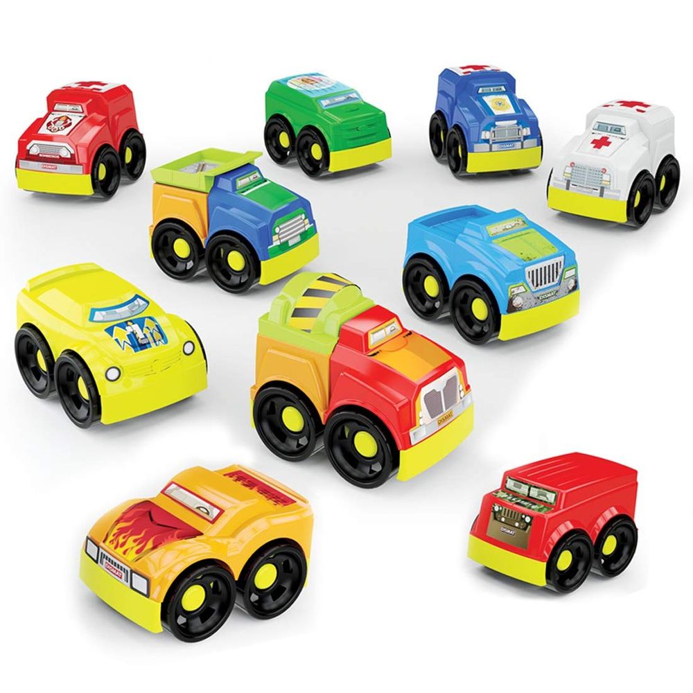 Contém: 10 chassis com rodas, 10 traseiras, 10 cabines, 1 caçamba, 1 betoneira e 2 cartelas de adesivos