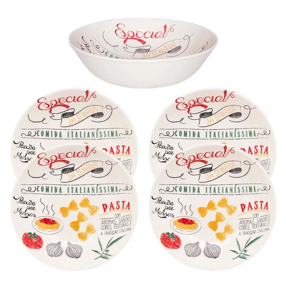 O conjunto para Massas elaborado pela Oxford oferece praticidade, beleza e sofisticação. Com peças fabricadas em cerâmica de altíssima qualidade e resistência, o conjunto conta com 1 tigela redonda com capacidade para 1,2L e 4 pratos para massa. Seu design clean contribui para deixar a mesa leve e com um toque de jovialidade, e sua estampa super colorida e moderna, exibindo desenhos de diferentes massas e frases como "Paixão por Massas" e " Comida Italianíssima", promete deixar as refeições muito mais alegres. Pode ser levado ao microondas e a lava-louças.Perfeito para servir à família e os amigos com muito estilo.