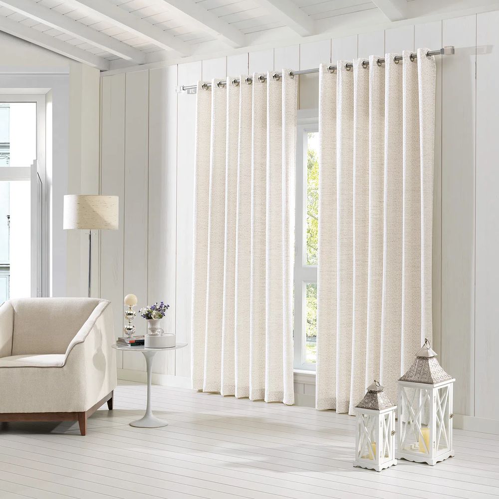 Cortina decorativa em tela jacquard de linho misto, para quarto, sala ou escritório. Seus detalhes em mini quadrados e sua cor neutra é o item perfeito para compor a harmonia do espaço, permitindo assim um ambiente mais claro e sofisticado. Possui ilhós cromado e permite luminosidade. 200 g/m²