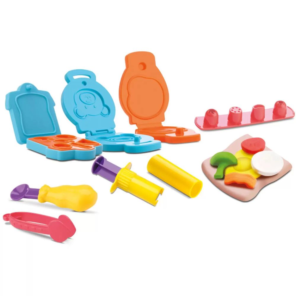 Contém: Formas e moldes, 4 potinhos de massinhas, 1 tigela, 1 pegador, 1 faca, 1 colher, 1 seringa com 4 bicos e rolinho.