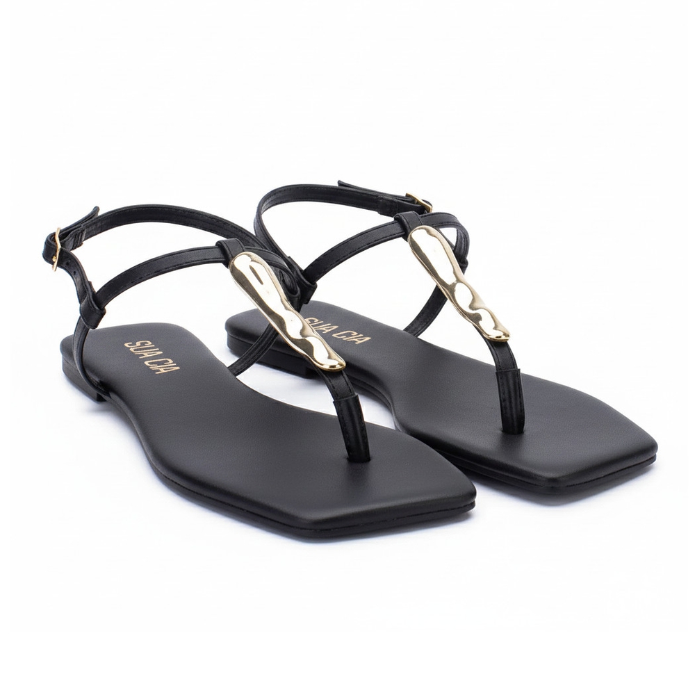 Sandália Rasteira Detalhe Dourado - Preta - Sua Cia