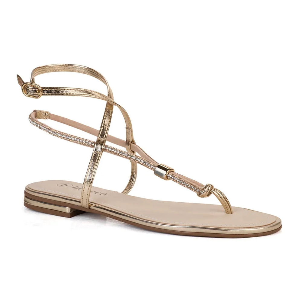Detalhes: Tiras finas com strass e acabamento dourado