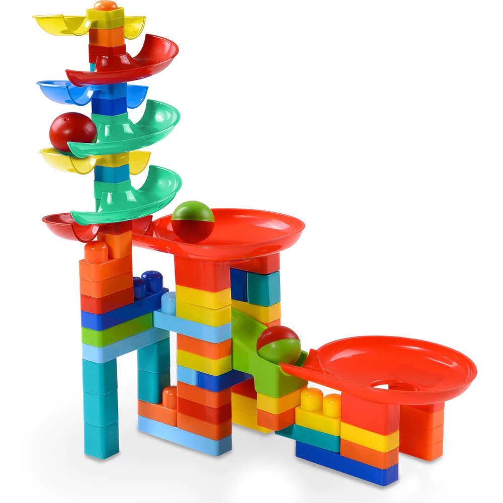 O conjunto vem com 61 blocos de montar, com cores vibrantes e seguras, é ideal para bebês e crianças pequenas, pois estimula a coordenação motora, enquanto brincam, possui também 7 rampas em espiral, mais 2 rampas em forma de funil e 3 bolas grandes que não podem ser engolidas.